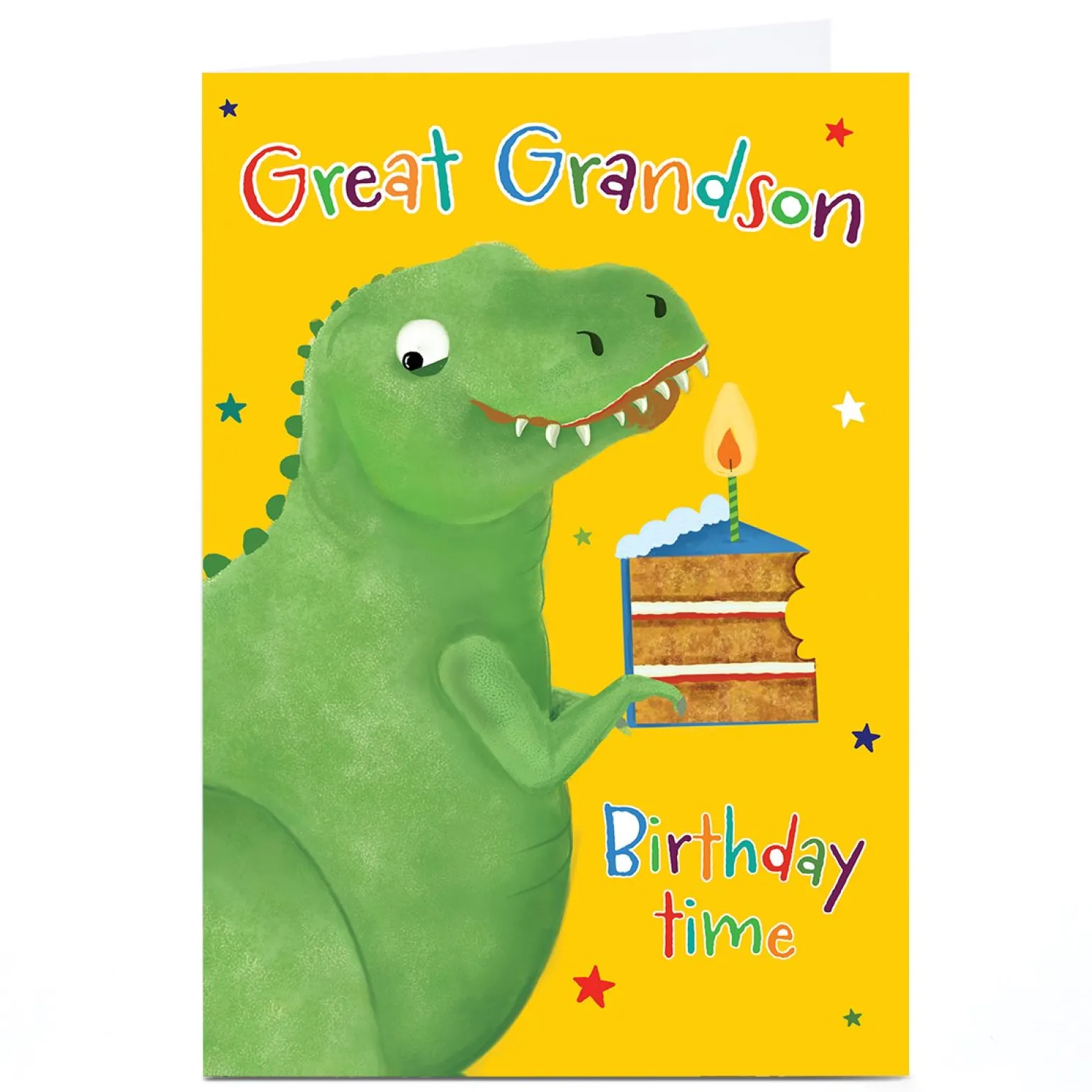 Personalised Birthday Card – T-Rex Dinosaur with Cake, Great Grandson