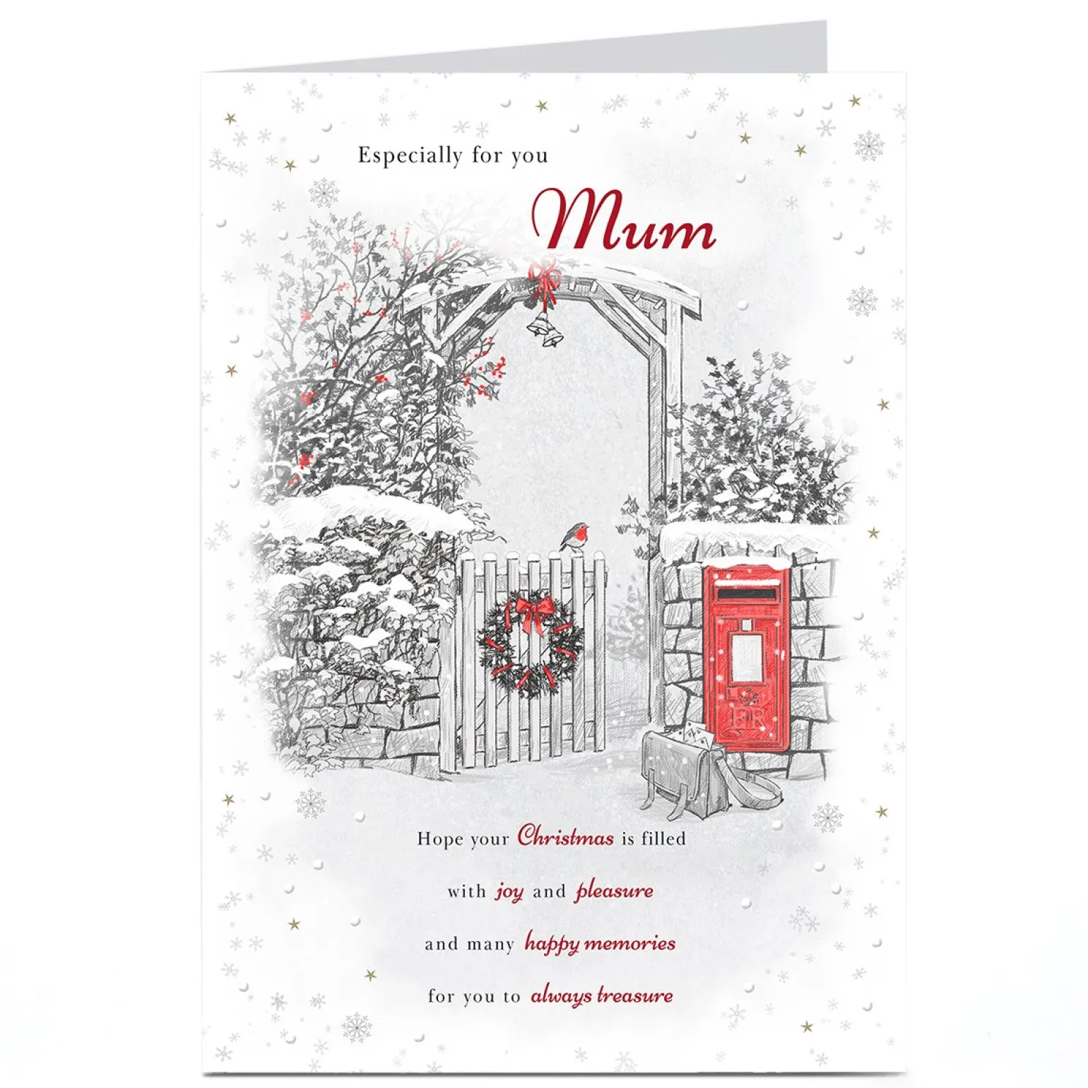 Personalised Christmas Card – Snowy Garden Gate, Any Name