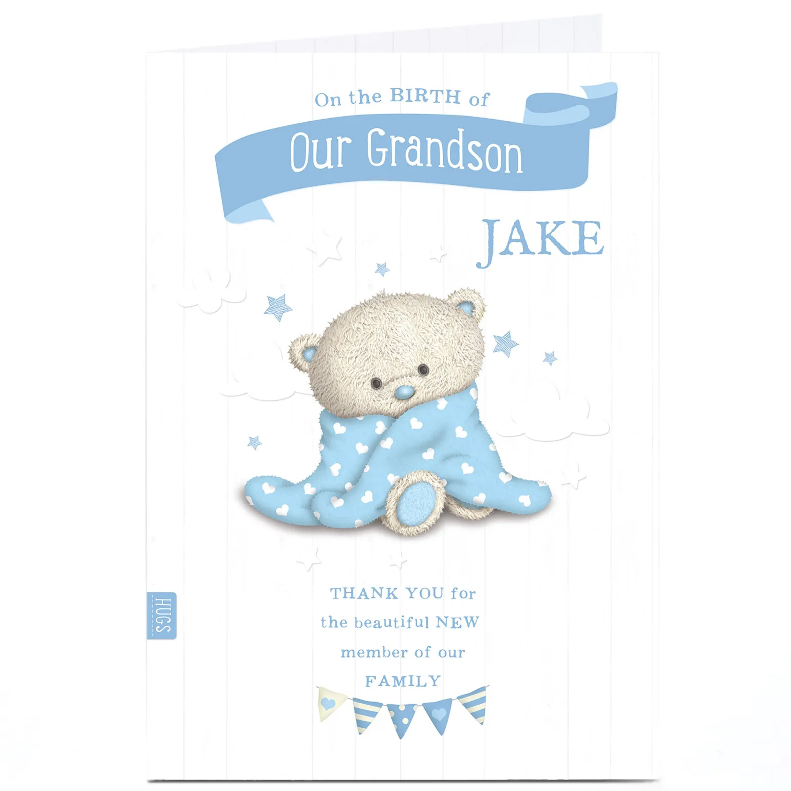 Personalised Hugs New Baby Card – Blue Baby Towel