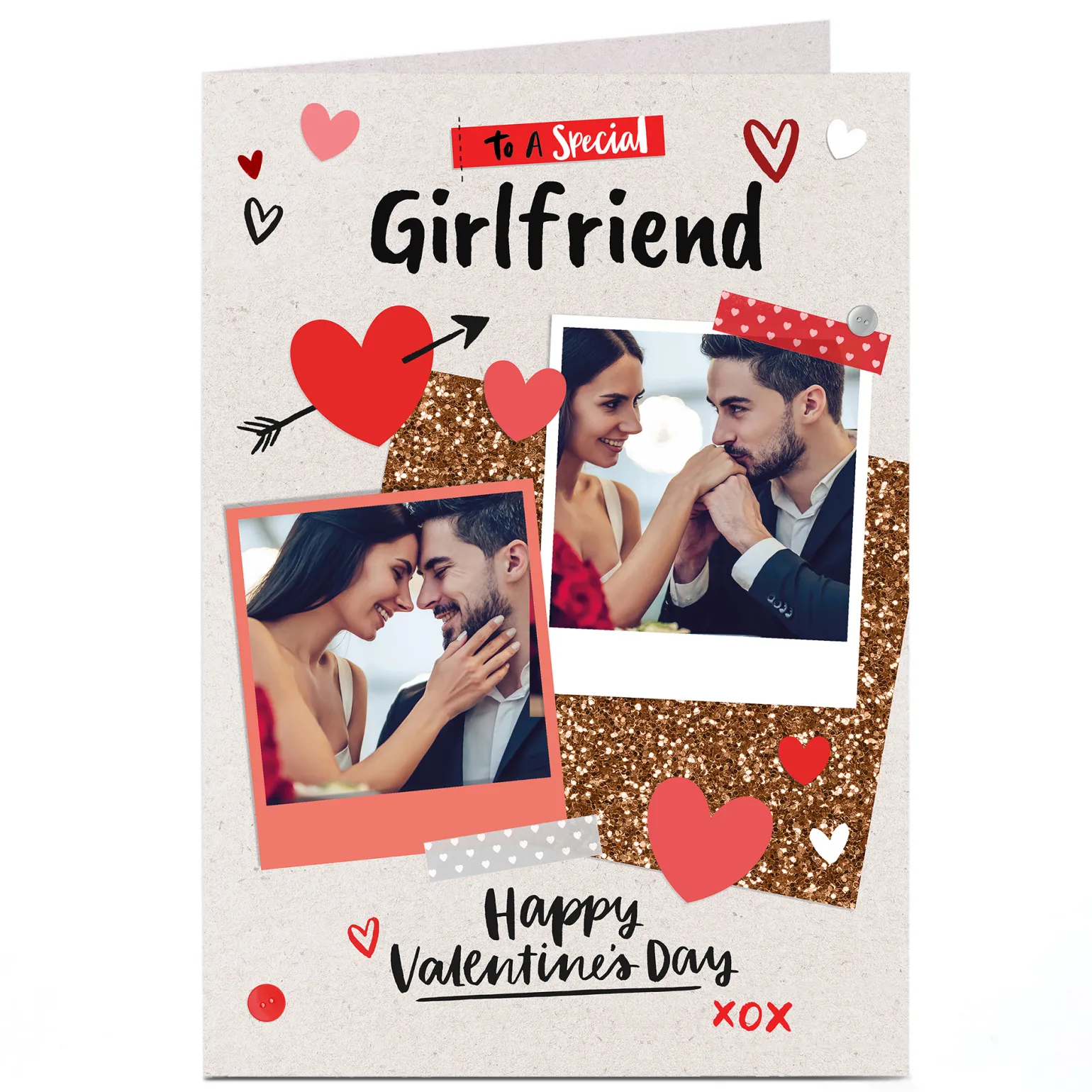 Photo Upload Valentine’s Card – Red Hearts & Polaroids, Girlfriend