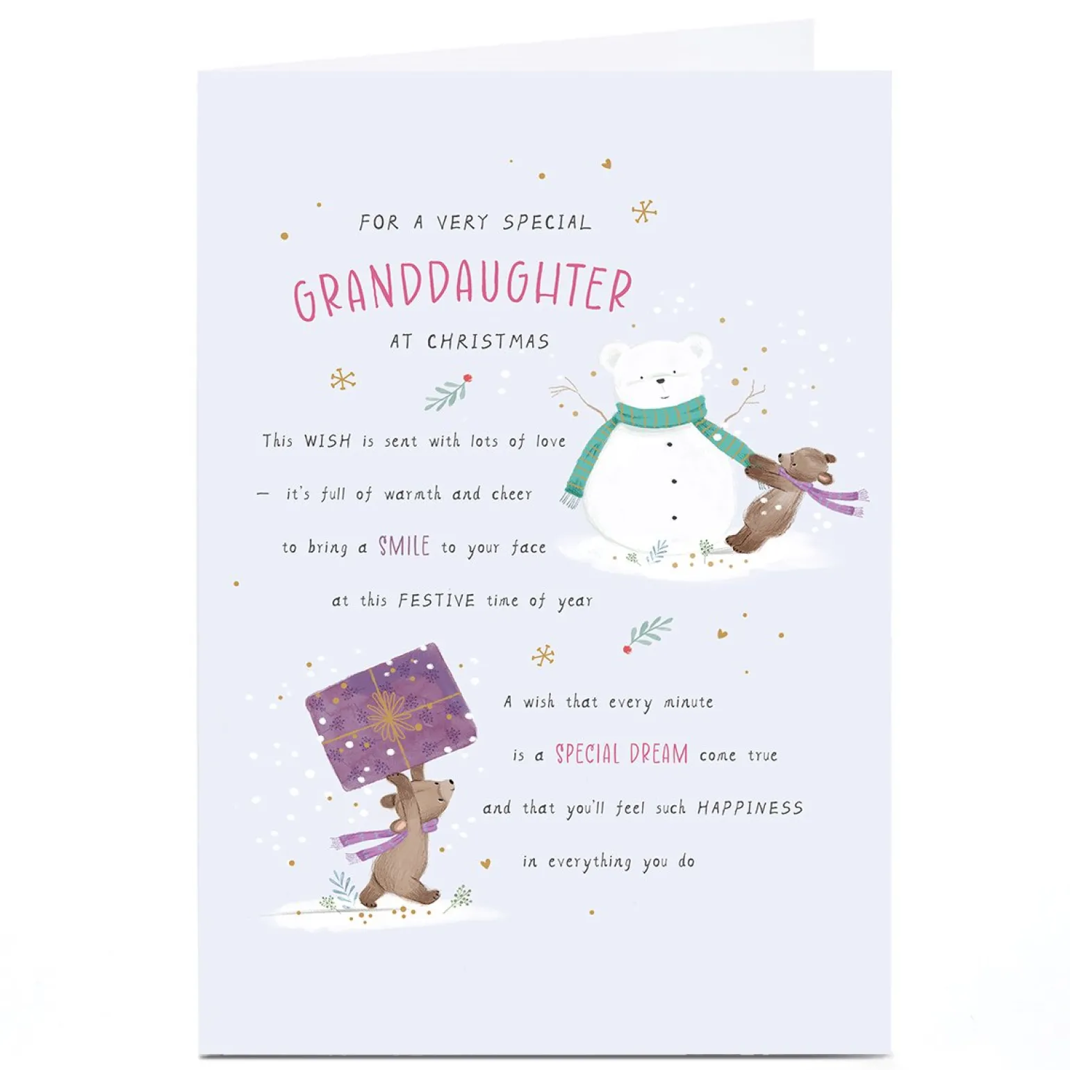 Personalised Christmas Card – Cute Bear with Snowman and Present, Granddaughter