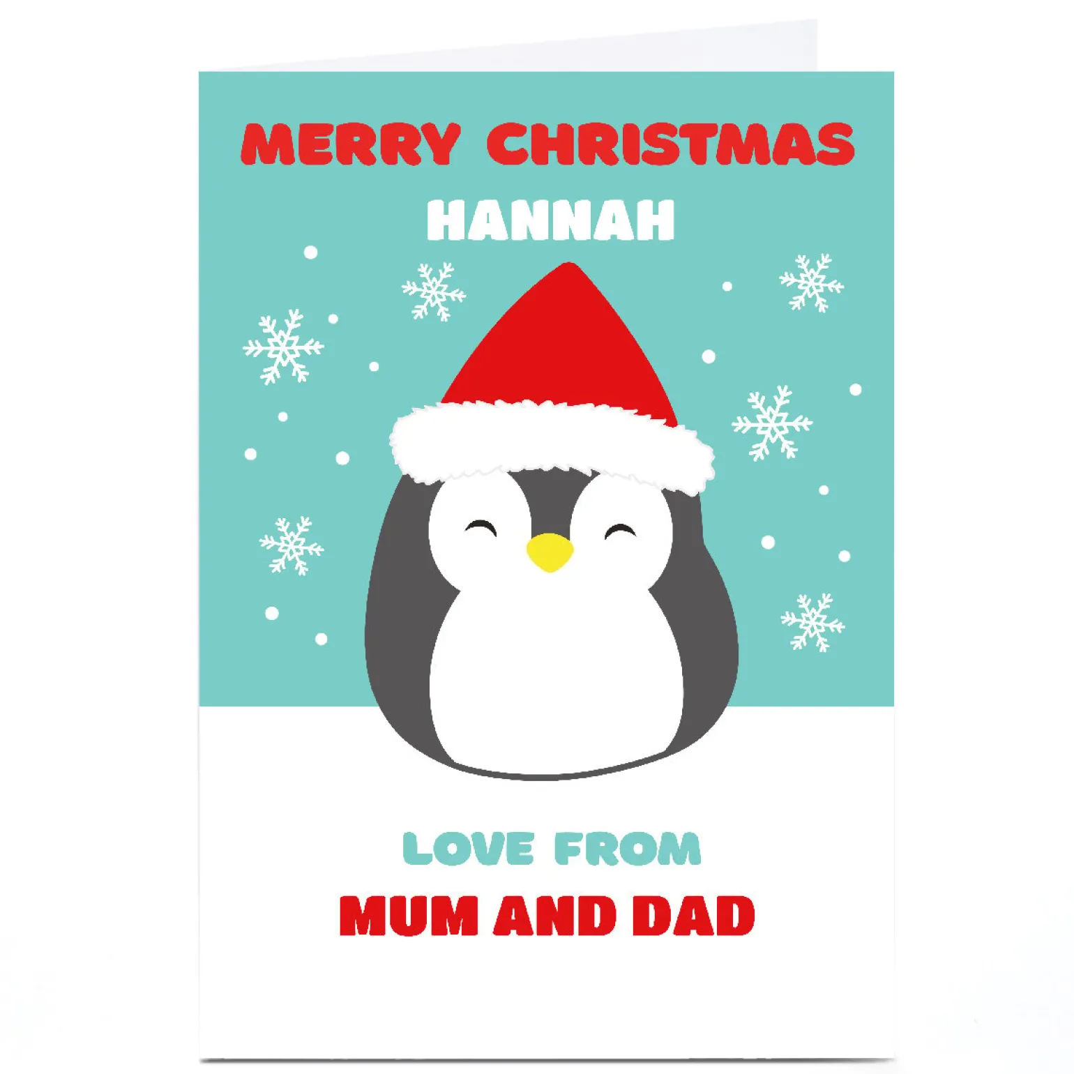Personalised Squishmallows Christmas Card – Penguin and Snowflakes, Any Name