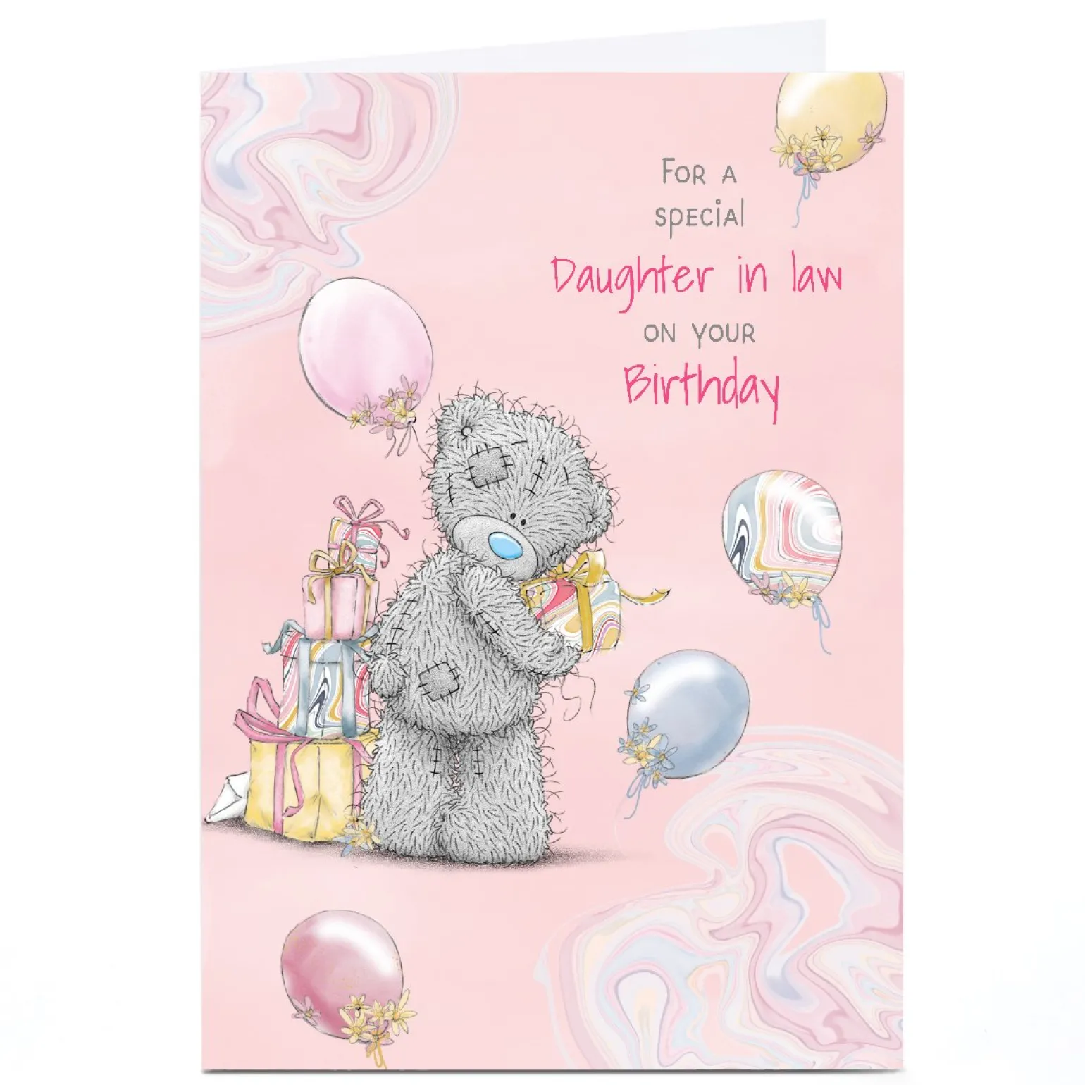 Personalised Tatty Teddy Birthday Card – Balloons and Presents, Daughter in Law