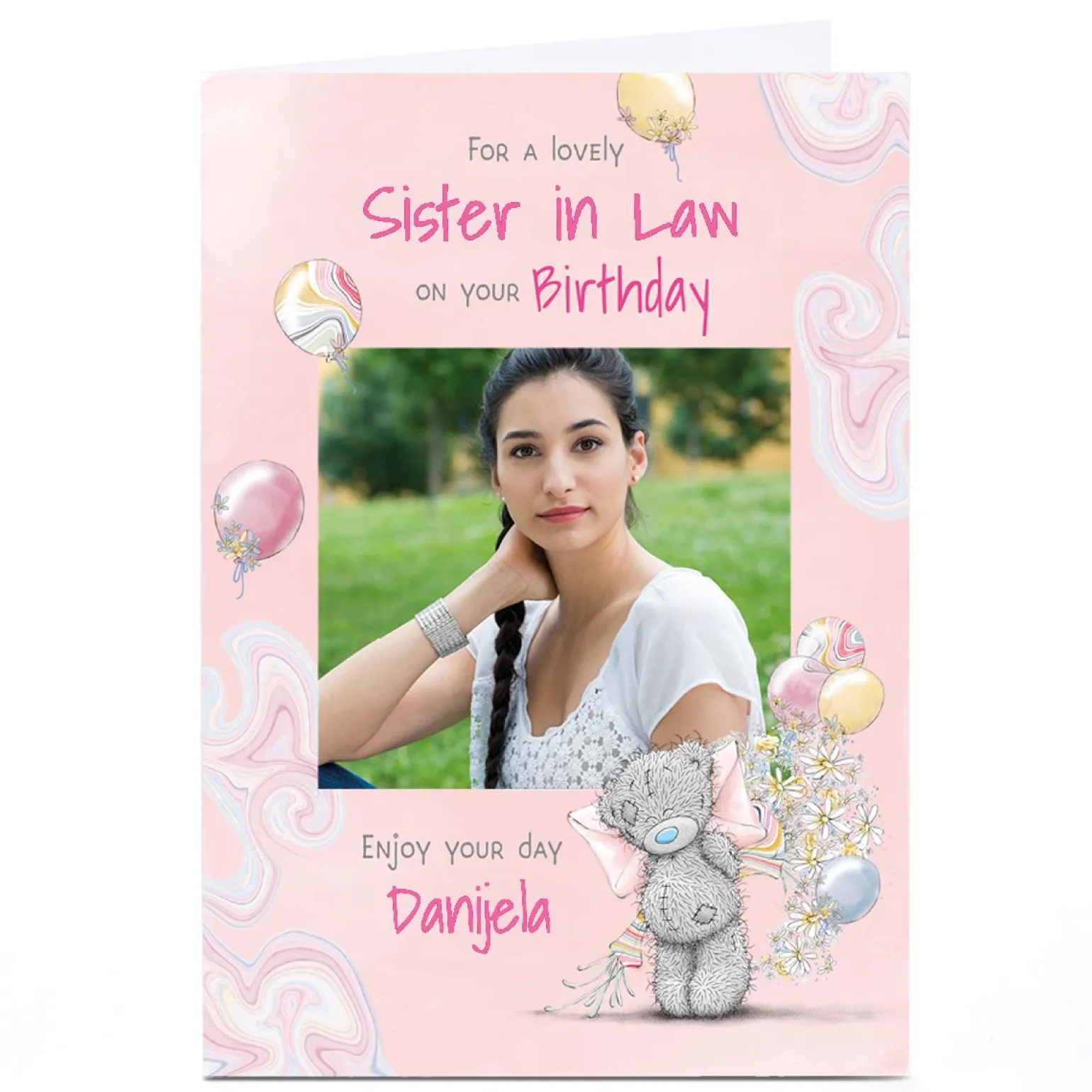 Photo Tatty Teddy Birthday Card – Floating Balloons, Sister in Law