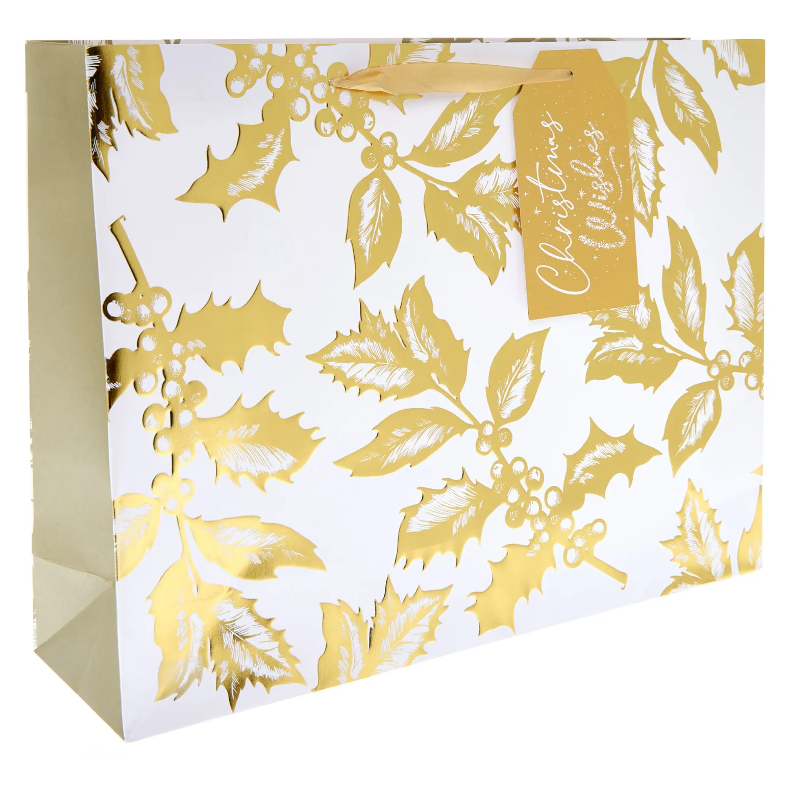 White & Gold Holly Extra Large Landscape Christmas Gift Bag